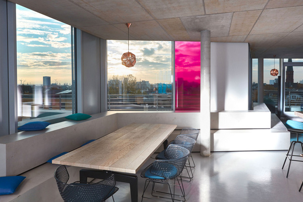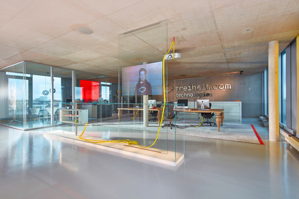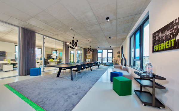 freiheit公司的文化精神通過室內(nèi)的裝飾材料和形式得以表達(dá)。組織團(tuán)隊(duì)的開放辦公區(qū)裝點(diǎn)以超大型的木制工作臺(tái);這里配有生活廚房、大禮堂以及亮麗的創(chuàng)客空間,隨手涂寫的黑板墻、大型木制工作臺(tái)、甚至還有壁爐,公司的程序員都在這個(gè)頂層空間共同辦公、合作與休閑交流。