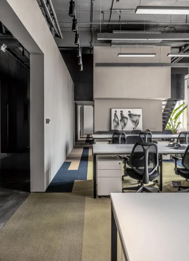 3、工業(yè)風(fēng)暗黑系辦公室設(shè)計(jì):極富張力的空間構(gòu)建、精彩的造型和圖形設(shè)計(jì)、暗黑色調(diào)中的藝術(shù)配色,整個(gè)空間在視覺的張力中呈現(xiàn)出工業(yè)時(shí)代的厚重感和當(dāng)代理念的時(shí)尚感。建筑內(nèi)部以槽鋼構(gòu)架呈現(xiàn)出原始粗獷的工業(yè)魅力,張弛有度的空間體量以及混凝土和木飾面又帶來親切的現(xiàn)實(shí)感。直白的空間構(gòu)建,加以色彩的輔助所產(chǎn)生的力量感和輕盈感,使整個(gè)空間充滿著視覺的張力和優(yōu)雅靈動(dòng)的藝術(shù)氣韻。室內(nèi)以開闊的木樓梯引導(dǎo)的中軸線規(guī)劃功能布局。木樓梯不僅緊密連接上下兩個(gè)樓層,也是多元化的活動(dòng)中心,面向?qū)?cè)的咖啡吧臺(tái),形成一處大型社交集會(huì)中心。在這條中軸線上還設(shè)有許多共享會(huì)議室等一眾輔助空間。中軸線兩側(cè)是工作區(qū),既有開放的共享工位,也有各種比例的獨(dú)立工作間。在整個(gè)暗調(diào)的氛圍中,設(shè)計(jì)團(tuán)隊(duì)以一抹亮黃驚艷了整個(gè)視覺!再加以深深淺淺優(yōu)雅晴朗的藍(lán)色,猶如一首輕盈悅動(dòng)的歌曲在空間流動(dòng)。