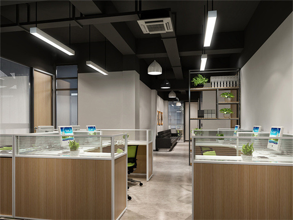 2、該創(chuàng)意園辦公室裝修案例主要以簡約工業(yè)化風(fēng)格主,設(shè)計(jì)師運(yùn)用光線的原理大面積使用玻璃隔斷,天花噴黑 地面油加固漆,使其整個(gè)辦公室更加通透、大氣且提高員工的舒適感。