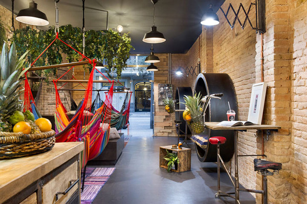 多彩的吊床由植物染色纖維制成、如皇冠一般組合懸掛的綠植;未經(jīng)修飾的粗糙磚墻與光滑的防銹鐵件形成材質(zhì)上的對比;拋光混凝土地面映襯著鮮綠與溫暖的質(zhì)感。