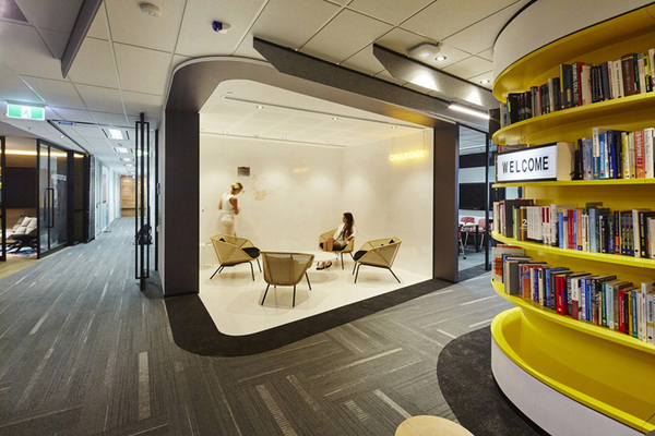 室內(nèi)*精彩的當(dāng)屬一處半圍合的“純白色房間”,白頂、白墻、白地,純凈的白色意在提供一個清晰的思維空間,讓創(chuàng)意靈感源源流動不被干擾。其它特色裝飾包括入口處的星火水晶玻璃墻、精美的天花、頂面定向裝飾的生態(tài)板、雙折門、特色照明燈具、豐富的地面材質(zhì)如木地板、塑膠地板和各色地毯、以及時尚的黑色儲物柜和漂亮的家具。