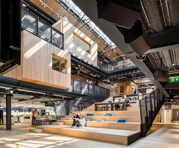 辦公室內(nèi)有29個鄰里單位,大型公共桌子取代了個人辦公桌。這些區(qū)域內(nèi)還包括了個人儲藏空間,一個或兩個高凳站立區(qū)域,以及一個沙發(fā)位。中心樓梯成為辦公室里的聚焦點。樓梯以“廣場”為名,把二層和地面層連接起來,使各樓層空間融為一體。多功能的樓梯能滿足多種用途,從能容納多達400人的會議和社區(qū)活動空間,到工作環(huán)境里的休息風格空間。