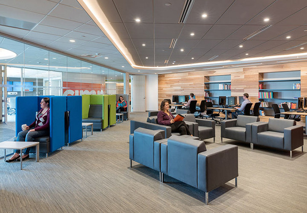 除了協(xié)作空間,設(shè)計團隊還設(shè)計了一處閱覽空間,給團隊成員提供一處寧靜的工作區(qū)。為了解決開放式空間所帶來的聲學(xué)問題,設(shè)計采取多種措施確保聲音的隱私性,以及視聽會議室和人多的房間的隔音性能。