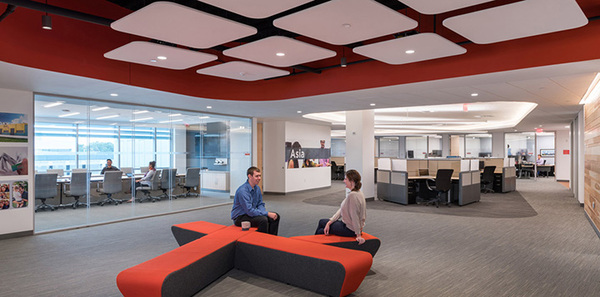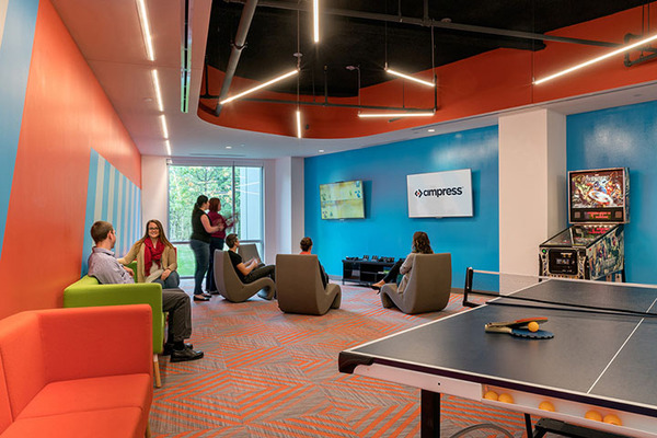 其辦公室裝修設(shè)計呈現(xiàn)出熱情洋溢、時尚活力的空間氛圍。躍動的色彩激發(fā)著人們的創(chuàng)意靈感;靈動的布局鼓勵員工的深度合作與交流;精彩的設(shè)計映射出Cimpress與時俱進、不斷發(fā)展前進的文化理念。