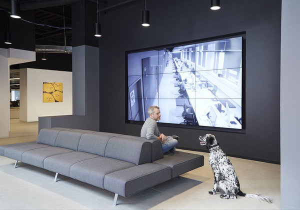 當(dāng)然作為創(chuàng)意公司,這里還規(guī)劃了一處大型集會(huì)空間,用以全體員工的聚會(huì)等活動(dòng)。各類(lèi)創(chuàng)新座位區(qū),比如在大型集會(huì)區(qū)用作空間分隔的階梯看臺(tái)座椅等。室內(nèi)的裝飾表面也具有多功能性,比如墻體和結(jié)構(gòu)柱大量運(yùn)用磁性玻璃、烤漆玻璃以及可黏貼或釘圖釘?shù)牟馁|(zhì),這樣可以隨時(shí)記錄創(chuàng)意構(gòu)想。