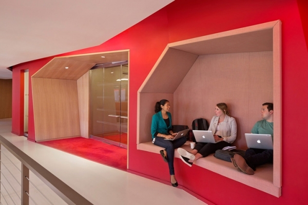 其它特殊功能區(qū)包括開(kāi)闊的中庭、休閑區(qū)、咖啡吧、酒館式空間等,這樣的設(shè)計(jì)旨在促進(jìn)大家更多的聚集和互動(dòng)交流,增加內(nèi)部的凝聚力,培養(yǎng)文化和知識(shí)的共享理念。