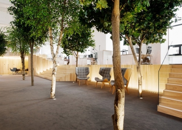 偌大的辦公空間沒(méi)有任何視野的遮蔽,以深紅、淺灰色地毯作為平衡,讓整個(gè)辦公室就像是漫游在夏日夢(mèng)境森林,放松又舒適,白色光線給空間制造通透感,然后以暖光襯出暖意。