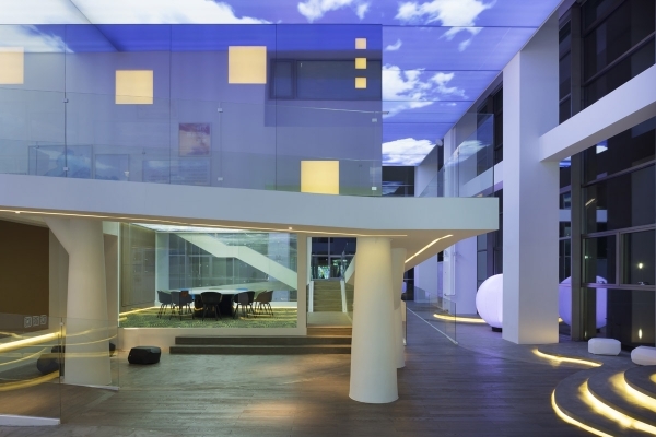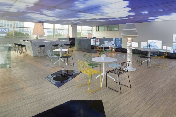 盡管這是個室內空間,裝修設計師仍希望通過大自然的圖案為來客營造舒適的感覺。天空圖案的天花,樹形的支柱,植物圖形,明亮的淺色調,木制材料和流線型的花園等,這些眾多的元素都將這個展廳裝點得與傳統(tǒng)意義上的售樓展廳與眾不同。
