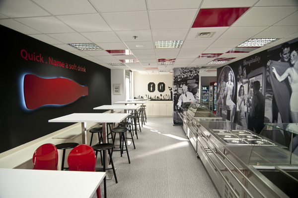 開放式的辦公空間強化了員工間的協(xié)調(diào)和交流,餐廳與休閑區(qū)域出現(xiàn)了大面積的復(fù)古元素,將可口可樂百年文化積淀的歷史傳承通過老海報融入到整體裝飾設(shè)計中,在跳躍的紅白色調(diào)中多了一份凝重和厚重感,也強化了可口可樂辦公室整體的企業(yè)氛圍與文化價值的傳達。