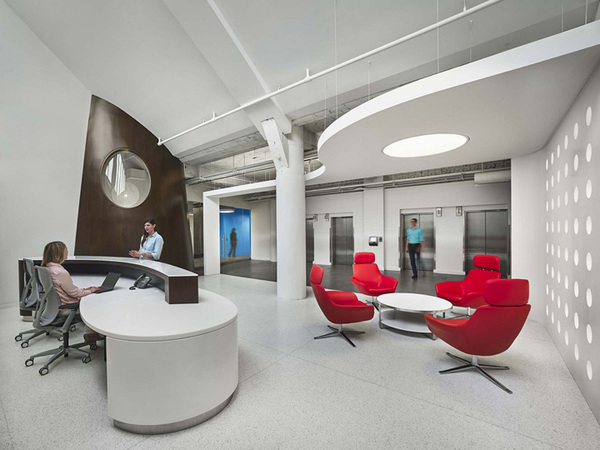 純凈的白色空間、巧妙的紅藍色彩點綴、隨處可見弧線形的機艙式設(shè)計,走進這里,如同走進科幻般的空中世界,帶來****的創(chuàng)新體驗。