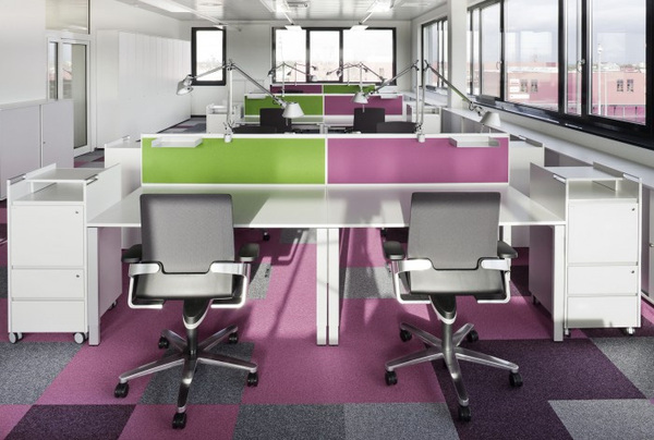 室內中庭一條寬敞的洋紅色樓梯將上下貫穿在一起,開敞的空間促進員工間的交流與合作。洋紅、魅紫和新鮮的草綠地毯,將中庭空間裝扮的猶如美麗的調色盤,優(yōu)雅清新靚麗。