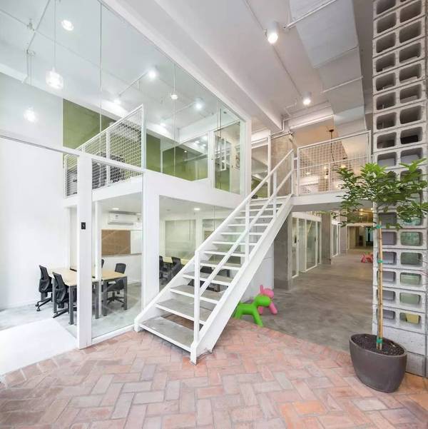由一十一建筑改造設(shè)計的位于深圳的一棟聯(lián)合辦公空間,建筑由一棟工業(yè)建筑的首層一部分改造而來。由于室內(nèi)具有很高的天花,在確保自然光線能達(dá)到場地較深區(qū)域的前提下,設(shè)計者在局部區(qū)域設(shè)計了夾層。利用天花的高度,創(chuàng)造出更多的變化形式。同時,利用一系列戶外建筑材料使用在室內(nèi)空間,作為重要公共區(qū)域的特色景觀墻,紅磚在室內(nèi)于室外的連續(xù)鋪設(shè),以模糊室內(nèi)外邊界和處理高差。