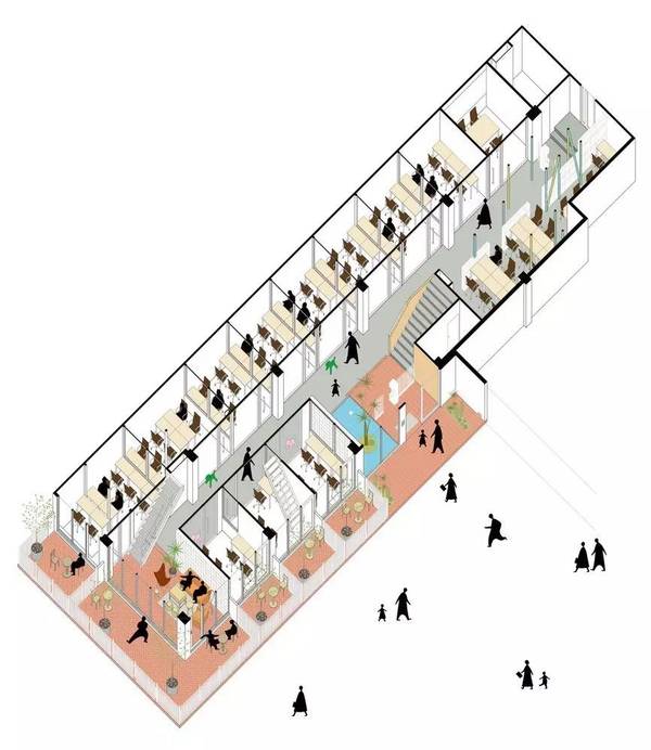 這樣的設(shè)計手法,給予室內(nèi)空間相互關(guān)聯(lián)。同時,設(shè)計者還對建筑入口進(jìn)行了從視覺化的處理,移除面向西南角的三角形的區(qū)域,改為透明的立面,將被涂鴉的磚墻重新組裝,以制造出不同的涂鴉樣式,以此表現(xiàn)建筑以及社區(qū)間層層疊加以及穿插的歷史。