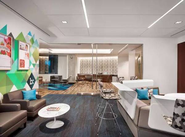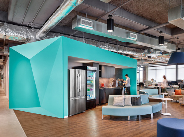 時(shí)尚辦公網(wǎng)很喜歡咖啡吧和休息室的設(shè)計(jì),巧妙的運(yùn)用不規(guī)則幾何造型,再涂刷以Bazaarvoice的品牌色系如:草綠、海藍(lán)、天藍(lán)和青色,讓整個(gè)空間充滿了清新活力。室內(nèi)還特別設(shè)計(jì)了一處名為 “Help Desk” 的網(wǎng)絡(luò)技術(shù)服務(wù)中心,實(shí)木的墻面、實(shí)木的格柵吊頂,配以黑色熱軋鋼制作的吧臺(tái)和溫暖的光照。