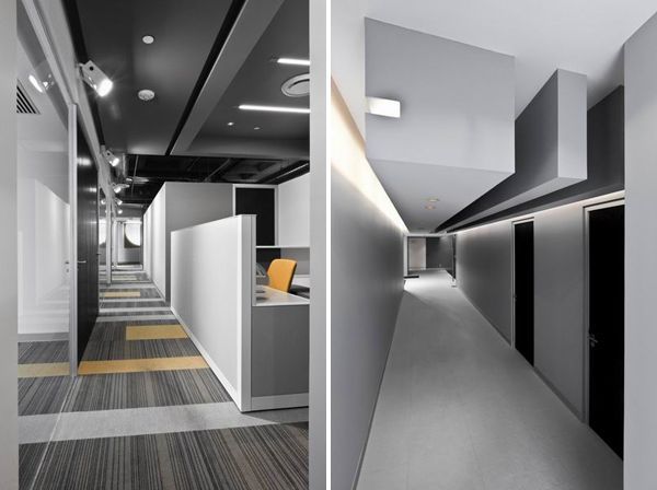 辦公室設(shè)計(jì)的辦公區(qū)域和走廊,灰色也不會(huì)顯得單調(diào)。灰色可以是地板,作為整個(gè)空間的輔助;也可以是主體,就像兩側(cè)墻壁上明暗不同的灰色組成的圖畫,吸引眼球。