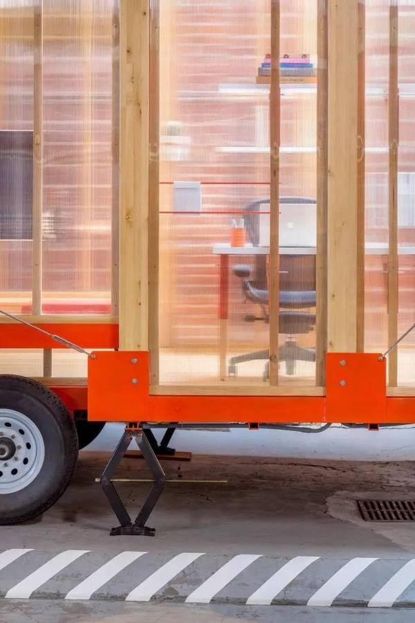 設(shè)計(jì)師保留了拖車的后梁結(jié)構(gòu),使用聚碳酸酯面板作為整個(gè)辦公室的墻壁。這種材質(zhì)的面板允許大量光線填充空間,同時(shí)也能吸收一些自然光,使得室內(nèi)光線不那么刺眼。設(shè)計(jì)師用從本地采購(gòu)的道格拉斯冷杉木來(lái)與半透明的墻壁搭配。 此外,他們還大膽的采用紅色以及其它鮮艷的顏色來(lái)活躍氣氛。