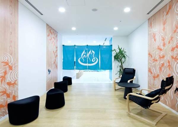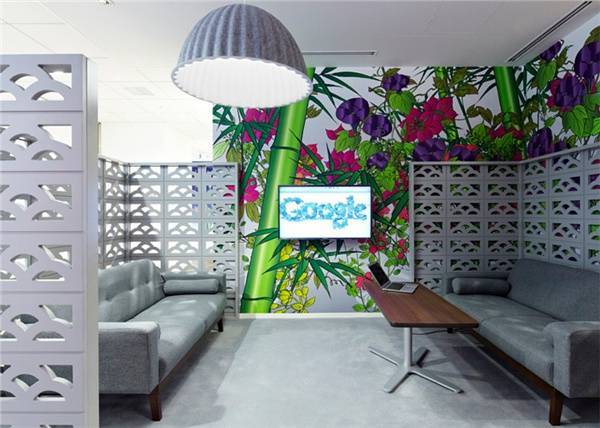 眾所周知,Google的logo由藍(lán)、紅、黃、綠四種顏色組成。這么多鮮艷的顏色混在一起,在進(jìn)行辦公室裝修時難免會面臨必須避免雜亂感的難題。但Google是不會放棄展示自我個性的,尤其是在進(jìn)門處這么顯眼的地方。而聰明的設(shè)計師選擇了通過軟裝修來協(xié)調(diào):黃色的接待臺,紅色的壁紙,綠色的“吉祥物”,以及地上藍(lán)、紅、黃、綠四色地毯,這些無不與墻上的logo相呼應(yīng)展現(xiàn)了錯落有致的層次感。壁紙上的和風(fēng)花紋,黃、藍(lán)、綠三色營造的仿若沙灘、海水和椰子樹的環(huán)境,再加上仿若沙灘椅的座椅,都展示了日本作為一個島國的特色。