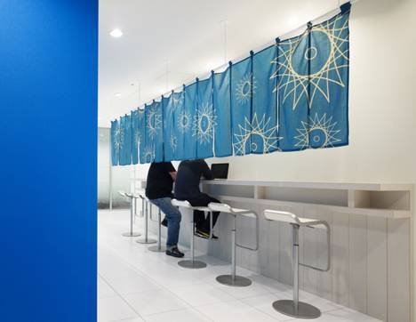 鯉魚、龜甲、青海波,種種元素都被毫不猶豫地拿來作為辦公室軟裝修的“工具”。澄凈的背景墻,再加上分隔空間的同時使人仿若置身于居酒屋的暖簾,都給人一種超脫物外的審美感受。置身此間,你會聯(lián)想到什么呢?是海風(fēng)拂面的清涼?親近自然的愉悅?還是一期一會的禪意?