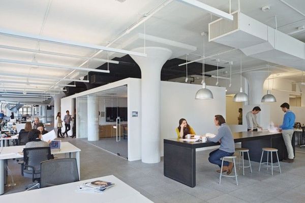 同事之間展現(xiàn)柜臺(tái)式會(huì)議,野餐桌會(huì)議室和開放式辦公區(qū)域。