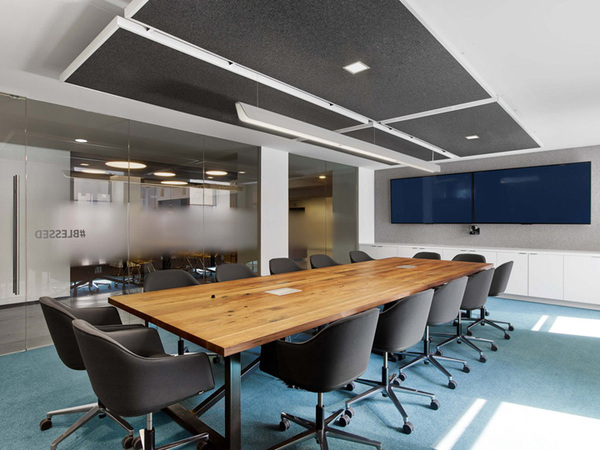 清朗凝練的空間更多了一份雍容典雅的都市氣質(zhì),依舊以藍色標志色為裝飾主調(diào),只是這次的藍色更暗雅、更富于細膩的變化。極富質(zhì)感的白蠟?zāi)静馁|(zhì)與黑色碳鋼構(gòu)件制作的家具,呈現(xiàn)出特有的都市氣質(zhì)。閉合的洽談室和會議室大多聚集于空間的內(nèi)部,以盡可能留出沿窗的空間令視線不被遮擋。連續(xù)而開敞的玻璃窗,讓室外城市美景盡收眼底,心情也變得豁然開朗。