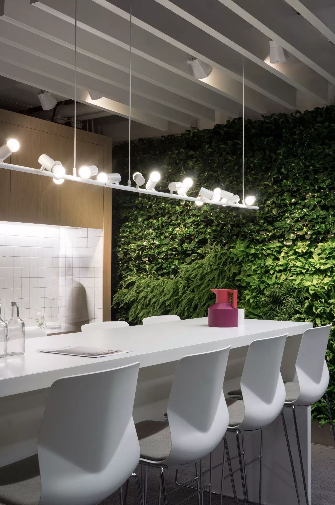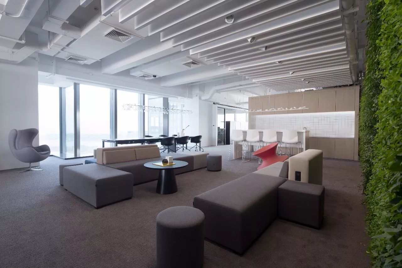 為了弱化傳統(tǒng)辦公室的緊張氛圍,公共休閑區(qū)配置了特別大的面積,包括大面積的垂直綠化墻、廚房及水吧。成為員工聚會、休息,或工作交流、頭腦風(fēng)暴的聚集地。模塊化的沙發(fā),能實(shí)現(xiàn)多變的組合方式,以及滿足員工360度全方位的無障礙溝通。