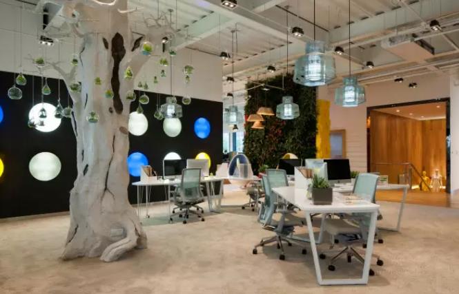 2、整個辦公區(qū)域就像是一個有趣的夢幻世界。顏色各異的圓形燈飾讓墻面變得生動,懸掛的透明燈具與其交相輝映。白色的大樹和色彩繽紛的飄窗、白色的懸掛隔斷,讓人像是置于一個夢幻的仲夏夜之夢中,綿延的彩色飄窗和玻璃吊燈打造出短暫休憩的吧臺。辦公空間也是輕松而舒適的,這里沒有擁擠,也沒有沉悶,只有舒適的地毯和柔和的光線。對于員工辦公區(qū)域的設(shè)計,設(shè)計師還在不同的墻面上大做文章,色彩鮮艷的模塊打造富有質(zhì)感的墻面裝飾,對于這樣活潑大氣的辦公空間,綠植是**必不可少的。富有創(chuàng)意的燈具讓生機(jī)的綠植都好像有了生命,想要隨時跳起舞來。辦公室休閑區(qū)的設(shè)計則顯得更為用心,沙發(fā)、抱枕、榻榻米,我們看到的不是一個辦公空間,而是一個屬于家的空間。而與休閑區(qū)相連的洽談區(qū)氛圍也顯得相當(dāng)輕松,與藍(lán)、黃兩把沙發(fā)不同的是,設(shè)計師特意打造的網(wǎng)狀座椅仿似天外來物從飄窗砸出,隨意而后現(xiàn)代。