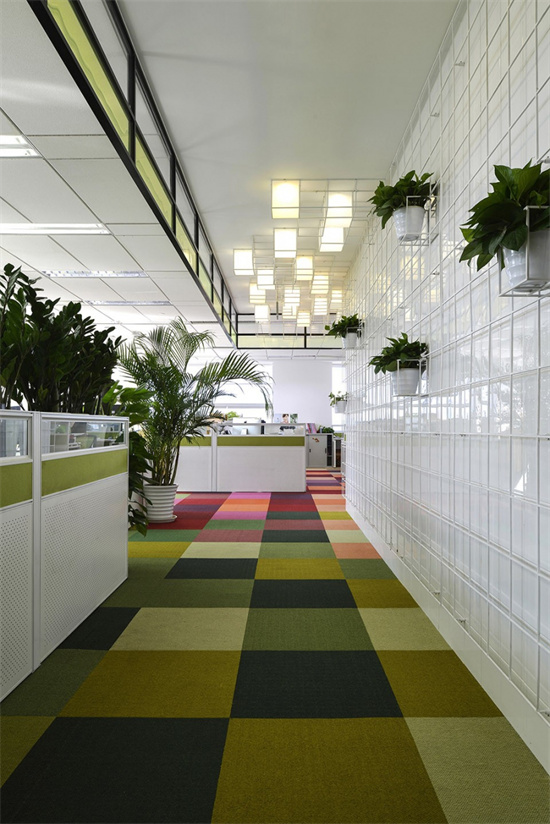 2000平方辦公室裝潢以彩色玻璃隔斷的顏色分出四個會議區(qū)域,紅黃藍綠。每個區(qū)域中的顏色又都有十幾種微妙的變化,共計54種彩色玻璃的顏色,在環(huán)形走廊上完成色彩的循環(huán)。在墻面上,設計師用白色瓷磚做辦公空間內(nèi)環(huán)形走道的墻面。利用材料的反射性能,彩色光暈在空間中能流動起來。像水彩在紙上洇開一樣,形成氤氳彌漫的效果。同時,考慮到辦公空間的進深較大,白色瓷磚能夠反射外部光線,增加室內(nèi)空間的光亮度。