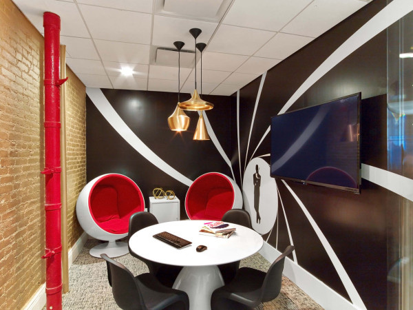 廣告公司辦公室會客區(qū)設計:裸露管道被刷成紅色,同時還設計了窩型的坐椅,很有創(chuàng)意感,墻壁上手繪了黑白線條的裝飾畫,空間布置得很有藝術(shù)范兒氣息。公司的VIP會客室設計了玻璃門可以保持大空間的通透感,室內(nèi)的墻壁和天花板都設計成紫色調(diào)的,帶來奢華神秘的視覺感,墻壁上掛著裝飾畫,為空間營造出藝術(shù)風氣息。