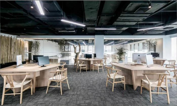 現(xiàn)代風格科技公司辦公室裝修設計中,柔和的空間被大量的顏色會讓幾何形圖案所覆蓋。木質(zhì)材料使空間變得溫暖多彩。照明設置和異形天花板吊頂使這個空間顯得****,非常顯眼。大量現(xiàn)代化設計元素賦予了該辦公空間的現(xiàn)代特色。前臺區(qū)域的設計,是為了化解受限的空間,利用三角形狀吊頂將空間視角向上提升,在公司入口處從視覺上就給人一種時尚、獨特、有科技感的感受。辦公區(qū)域的設計,利用多種幾何形狀、色彩鮮艷的色塊對辦公空間做功能劃分,讓空間不僅創(chuàng)意滿滿,符合企業(yè)的文化需求,同時還要滿足員工的功能使用需求。因此,設計師為其打造了一個擁有活力、激情的工作環(huán)境。舒適的辦公家具,以簡潔和辦公一體化的現(xiàn)代風格呈現(xiàn),打破傳統(tǒng)室內(nèi)設計形式。白色基調(diào)的墻壁和簡單的木式辦公桌,窗明幾凈的大幅落地玻璃窗,使得整個空間開闊明亮,營造了一種輕松舒適、積極向上的企業(yè)文化氛圍。