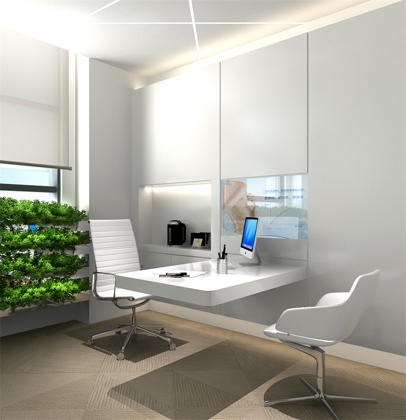 這間獨(dú)立辦公室,空間面積不大,但房間形狀規(guī)整。所以設(shè)計(jì)師在窗邊下臺面做了綠植架設(shè)計(jì),純白色的辦公空間添加綠色的植物,空間立刻活力顯現(xiàn)。