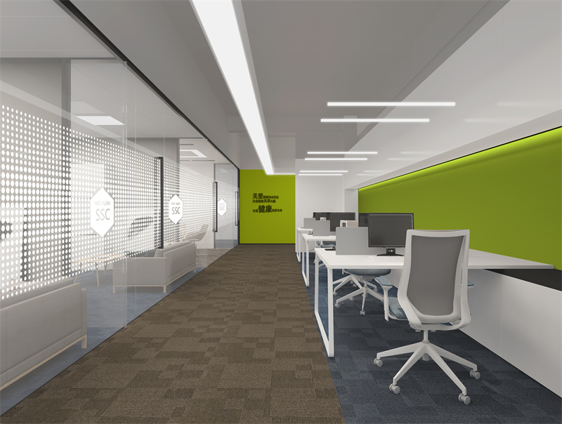 2、其次辦公空間內(nèi)靠近過道的獨立辦公室,靠近過道的一面盡量使用玻璃隔斷,以玻璃隔斷的通透性為空間視覺帶來更佳寬敞的體驗。辦公室內(nèi)天花不宜過低,如果公共辦公區(qū)很大,層高卻不夠高的話,可以在公共辦公區(qū)使用裸頂,過道和其他地方使用吊頂。這樣公共辦公區(qū)與過道天花的對比不僅能清晰的劃分公共辦公區(qū)的空間,也能夠使空間垂直延伸感增強,使人在視覺感處上更加舒適。