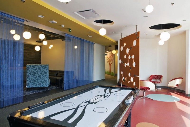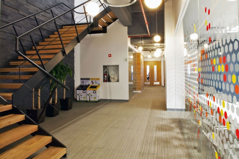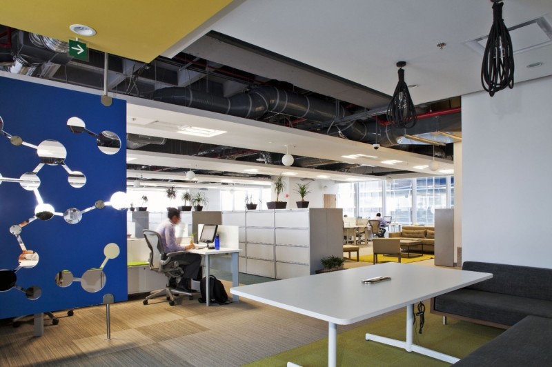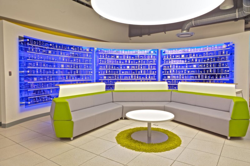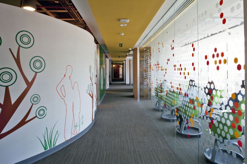 辦公空間的設(shè)計簡約時尚而充滿童趣,走出電梯間便是一個圓形的開敞式接待區(qū),接待區(qū)兩側(cè)是由兩個藍(lán)色玻璃組成的展示墻,玻璃上繪有興康藥品產(chǎn)品外形樣式,接待區(qū)的中間區(qū)域是以綠色植物為背景的接待臺。走廊兩側(cè)的墻壁上繪畫著抽象的圖案,圖像有著積極向上和強(qiáng)勁生命力的寓意,符合興康的企業(yè)文化。在工作區(qū)設(shè)計師打破了千篇一律的工作形式,營造了一個輕松,寬敞,開放,點(diǎn)綴著休閑元素的辦公環(huán)境,家具的高度被刻意的降低,目的是為了讓所有的工作人員都能享受自然光和戶外迷人的景色。