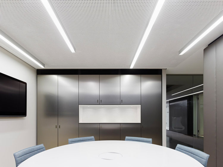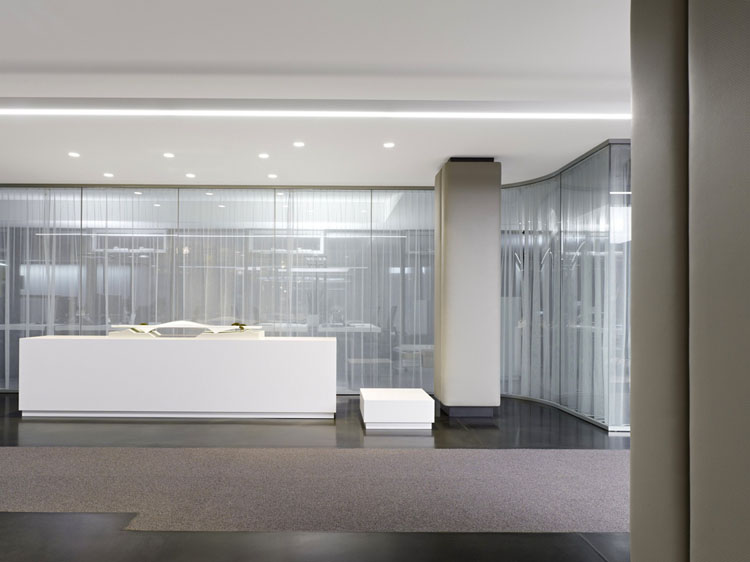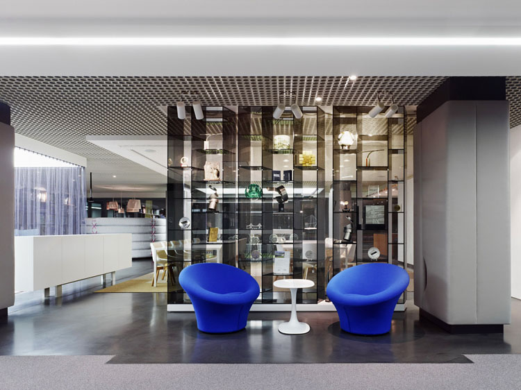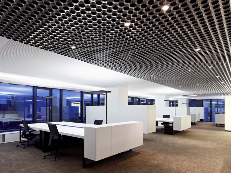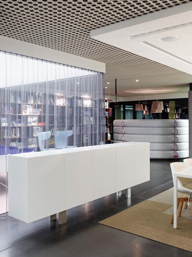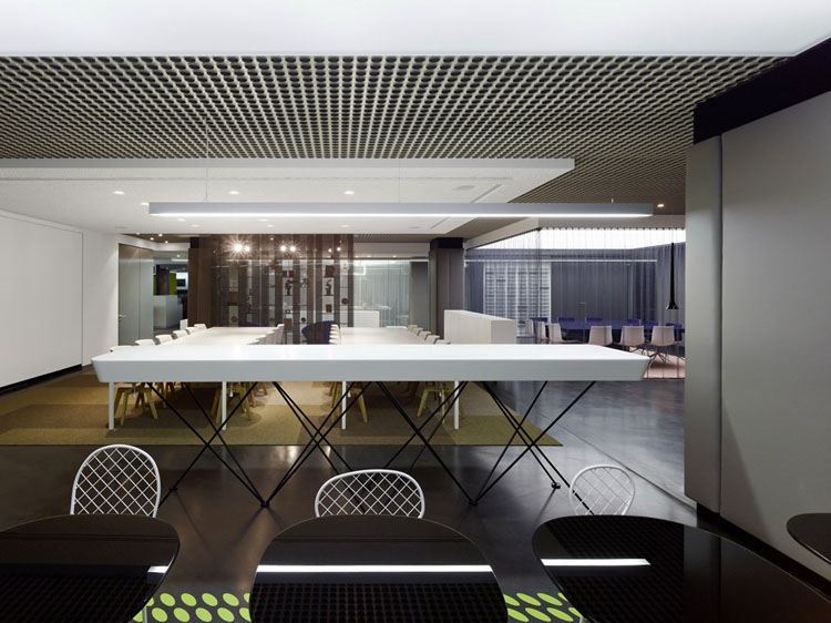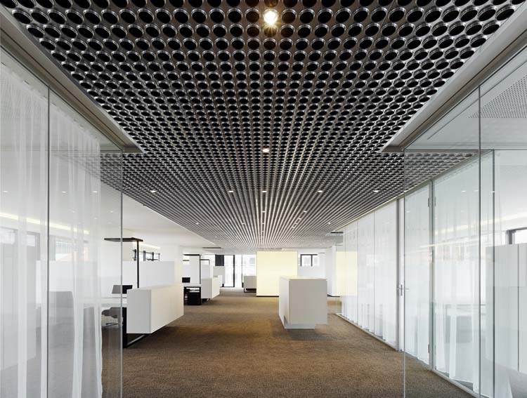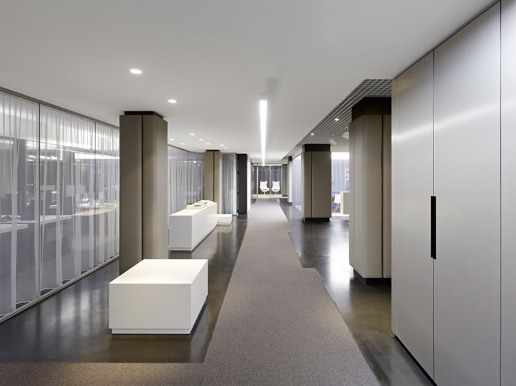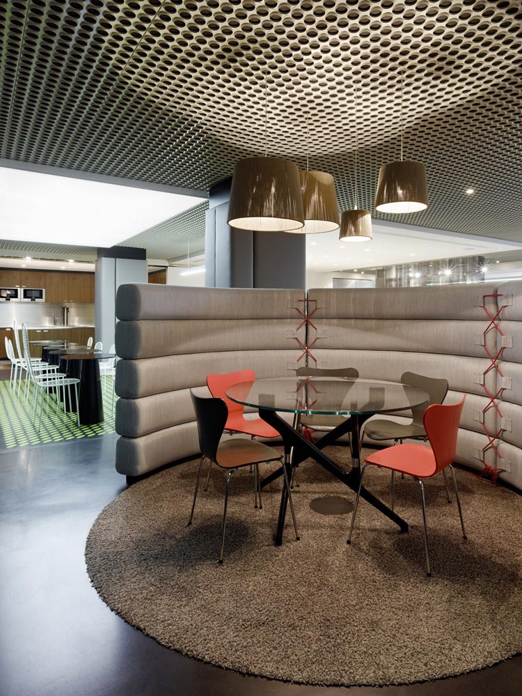 其概念是設(shè)置一個(gè)為所有部門共用的交流空間,以及滿足不同協(xié)作需要的不同分區(qū)。原先單獨(dú)、分散化的辦公室變成大型開放式的辦公空間,鼓勵(lì)同事之間的交流。每一個(gè)樓層都有單獨(dú)的辦公室和單獨(dú)的工作組空間,以及大型開放式工作間。各個(gè)工作站的工作人員能夠相互交流。玻璃立面的辦公室中,十字形的結(jié)構(gòu)將開放式的空間分隔為各個(gè)單元,但又是集中的工作環(huán)境。一系列暖色調(diào)的材料營(yíng)造出不同的氣氛,有時(shí)候讓員工感覺到像在家里一樣。辦公樓中的地毯有著清晰的路徑指示和功能分區(qū)。就餐區(qū)地板上的綠點(diǎn)如同變魔術(shù)一樣變出草地的效果,構(gòu)筑起通向露臺(tái)的一道概念式的橋梁。向露臺(tái)打開的半圓形裝飾空間與其他部分區(qū)分開來(lái),透明的蕾絲幕布構(gòu)成了半私密的空間,而清新的色彩、深藍(lán)色的桌子和粉色的地毯,無(wú)不為員工帶來(lái)激發(fā)工作情緒的氛圍。